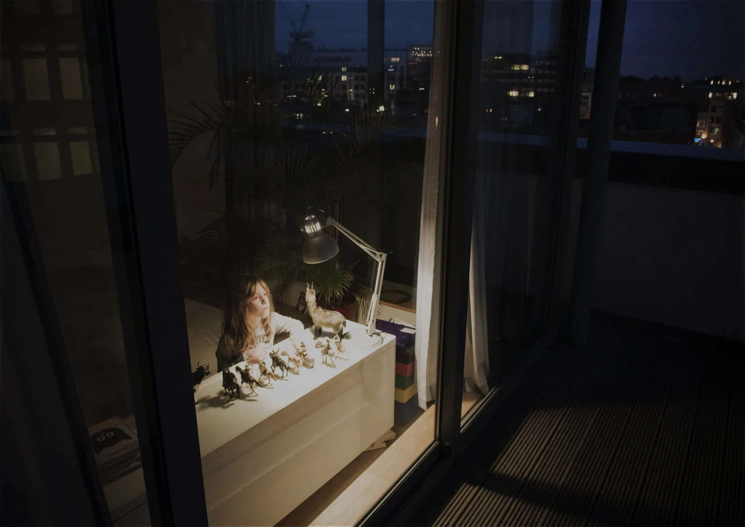 My project is a game. I arrive at an unfamiliar home at dusk and ask what worlds the children would like to create. They select their own props and I withdraw to observe them from the outside.